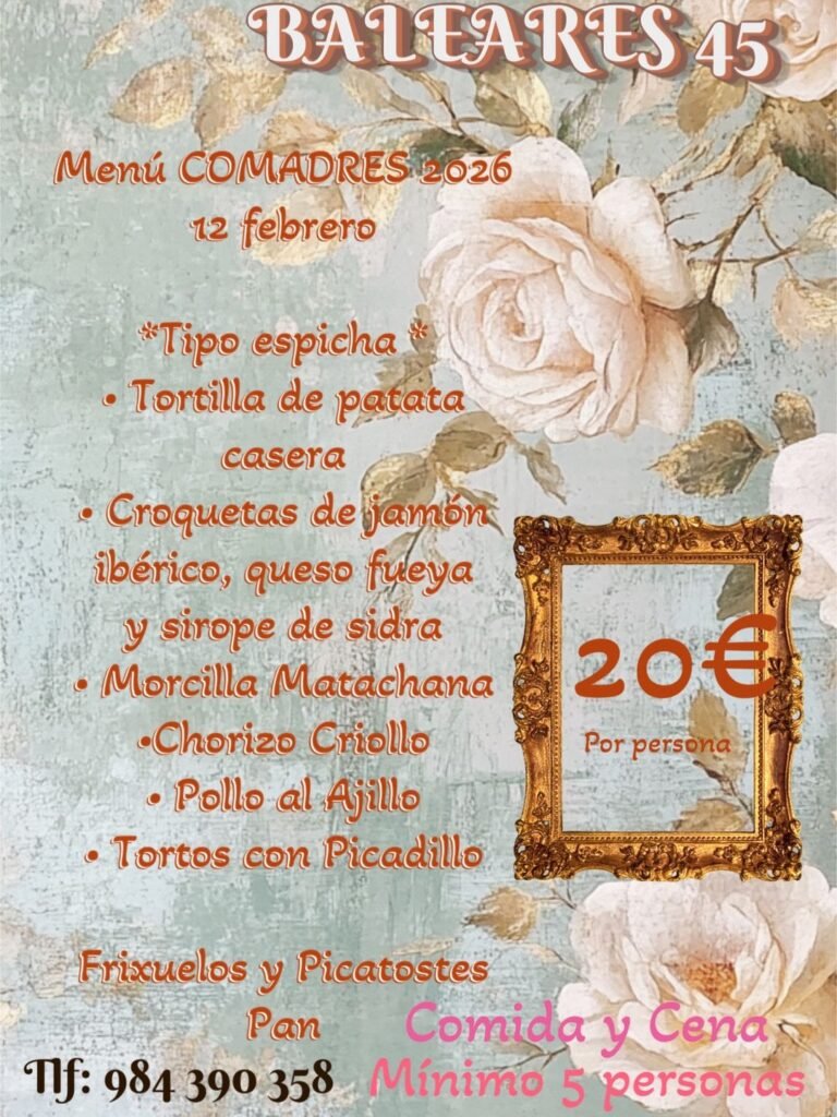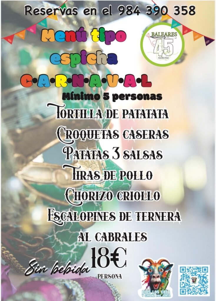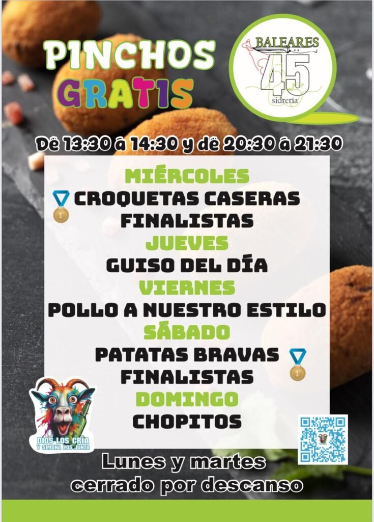 En Sidrería Baleares 45 te invitamos a disfrutar de nuestros pinchos gratis cada semana. De miércoles a domingo, ven de 13:30 a 14:30 o de 20:30 a 21:30 y prueba nuestras especialidades: croquetas caseras finalistas, guiso del día, pollo a nuestro estilo, patatas bravas finalistas y los irresistibles chopitos del domingo.Un plan perfecto para venir con amigos o familia y disfrutar de cocina casera, ambiente cercano y producto de calidad. Te esperamos en Baleares 45. Los lunes y martes descansamos para volver con más sabor.